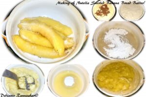 I started preparing for the Banana Bread after returning from office on the same day and when done with the preparation, I decided to add something extra to make the regular Banana Bread a bit special… On that thought, I started checking both my fridge and store and found a small bottle of Nutella! Eureka! And what else!!! Well nothing but two loaf of Nutella Swirled Banana Bread!