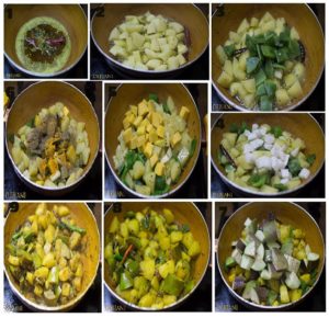 - Begin by peeling and cutting potatoes, pumpkin, radish, and eggplant into small cubes.