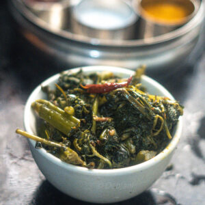 Well, when talking about Kali Pujo Bhog, I can't leave out what we cook the day before, on Bhoot Chaturdashi: Choddo Shak. The day before Kali Puja, known as Bhoot Chaturdashi, Bengalis follow the special tradition of preparing Choddo Shak, featuring a delightful blend of 14 different leafy greens, all cooked together. This special dish, we enjoy at lunchtime, gets its unique name from the very ingredients that make it so special: the 14 "shak," or greens. Each of these greens represents a different aspect of life and the world around us. To discover more about this dish, including the recipe, check out the main post.